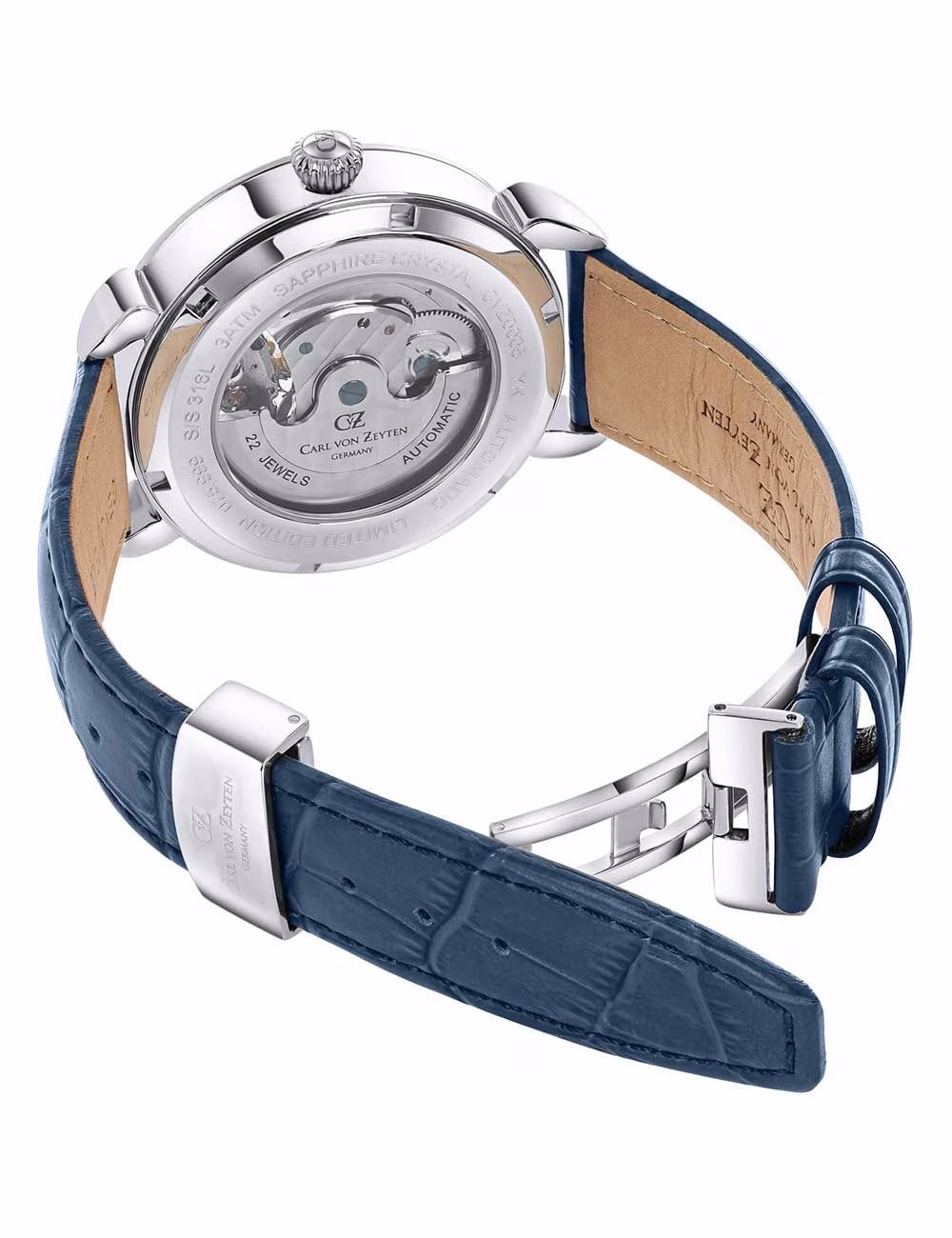 En el corazón de este reloj se encuentra un movimiento automático que, como es habitual en los relojes Carl von Zeyten, garantiza un cronometraje preciso y ofrece las siguientes funciones: hora, minuto, 24 horas, segunda zona horaria.