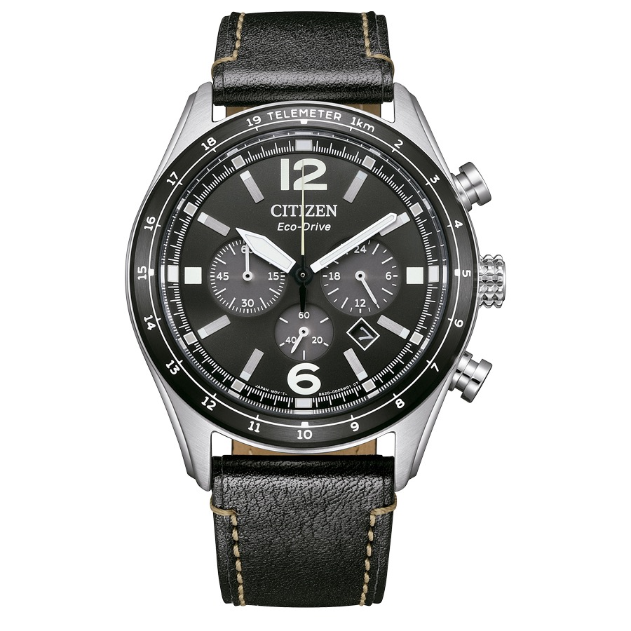 Caja de acero, grosor 11,6mm., con fondo cerrado a rosca. Correa de piel. Agujas e índices con luminous. Bisel black fijo con taquímetro.