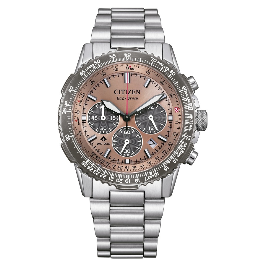 Caja de acero, 13,8 mm. de grosor, con fondo cerrado a rosca y corona a presión. Brazalete de acero con cierre de doble pulsador. Bisel giratorio bidireccional con regla de cálculo. Cristal de zafiro plano con tratamiento antirreflejos. Luminous en agujas e índices. Esfera metálica. Magnetic Resistant. WR 20 bar.