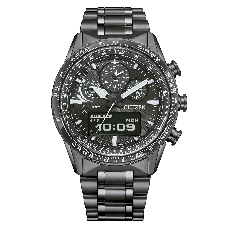 Sección analógica: hora, minuto, segundo, reloj 24 horas, UTC. Cronógrafo (minutos, segundos). Sección digital: hora, minuto, segundo, huso horario. Calendario: año, mes, fecha, día de la semana. Cronógrafo. World Time: 43 áreas, incluidos 29 husos horarios. Timer 99 minutos. Indicador Ligh-Level. 2 alarmas. Perpetual calendar hasta 31/12/2199. Indicador nivel de carga batería Eco-Drive. Funciones: prevención de sobrecarga, aviso de carga insuficiente, asignación de la diferencia horaria, detección de impactos. Selección de idioma. Luz LED.