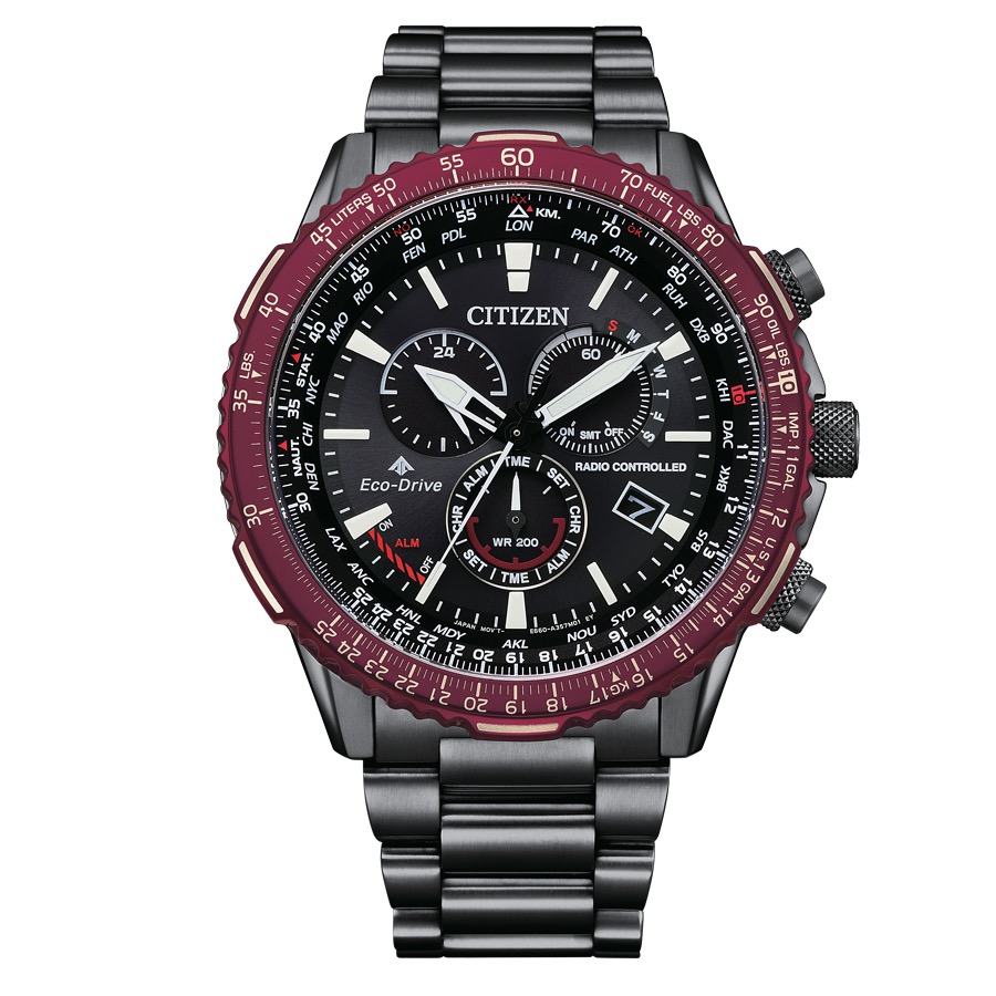 Caja de acero IP grey, 13,7 mm. de grosor, brazalete de acero IP grey con doble cierre de seguridad. Bisel IP red giratorio bidireccional con taquímetro con regla de cálculo para pilotos. Cristal de zafiro con tratamiento antirreflejos. Agujas e índices con tratamiento luminius. Calendario. WR 20 bar.