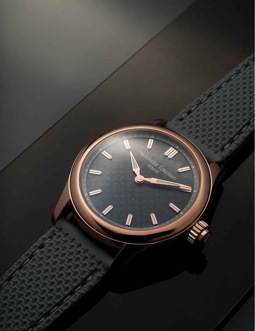 El cristal de reloj tipo “vidrio de zafiro, antirreflectante” ofrece una amplia protección contra arañazos y lesiones accidentales. Debajo está la esfera del nuevo reloj de tus sueños en el color negro. Manos luminosas, Índices ilumin. contribuyen a la iluminación del Frederique Constant FC-286LGS3B4 y permiten una buena legibilidad incluso en condiciones de iluminación desfavorables.