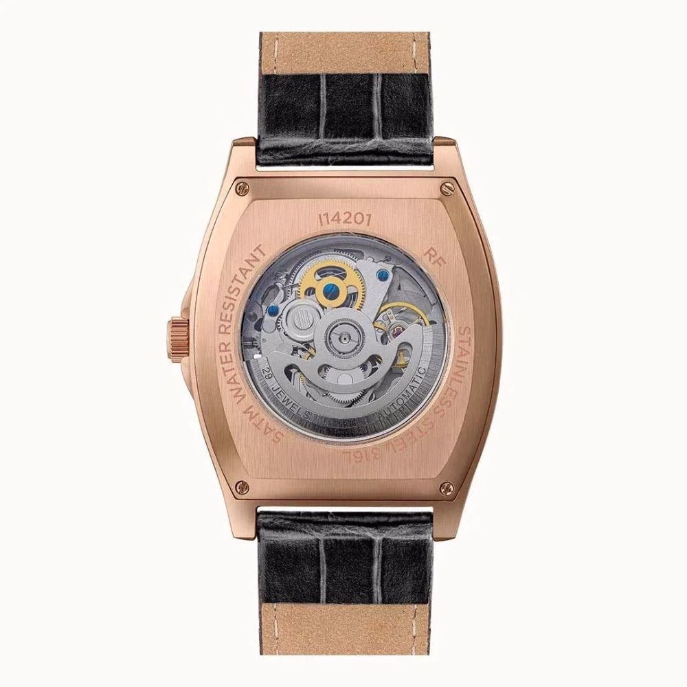 El reloj de pulsera tiene una carcasa de de color ora rosa, hecha de acero inoxidable, que se ve como un verdadero punto de atracción gracias a la superficie pulido.