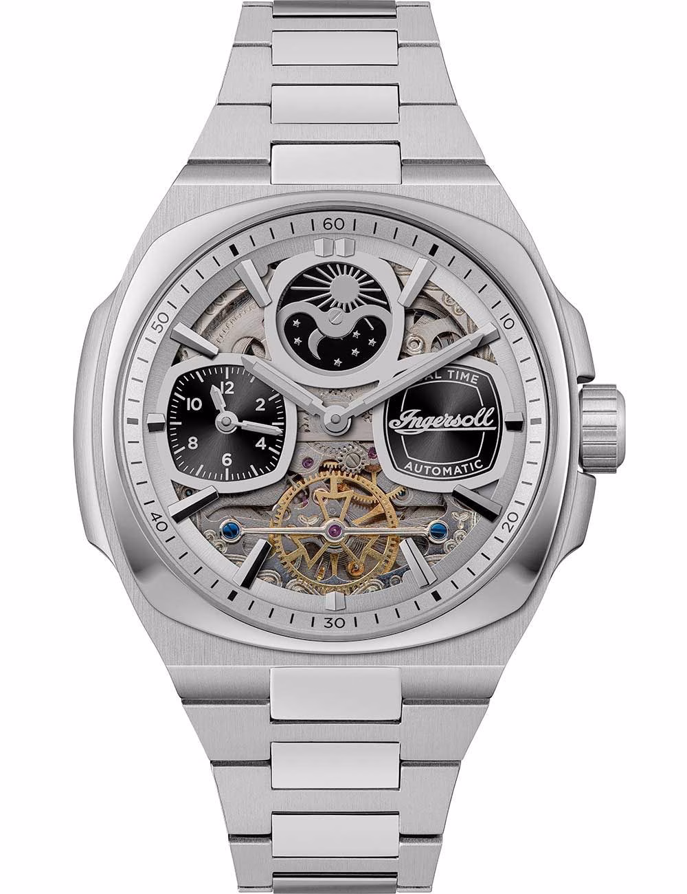 En el corazón de este reloj se encuentra un movimiento automático que, como es habitual en los relojes Ingersoll, garantiza un cronometraje preciso y ofrece las siguientes funciones: hora, minuto, segunda zona horaria, día y noche.