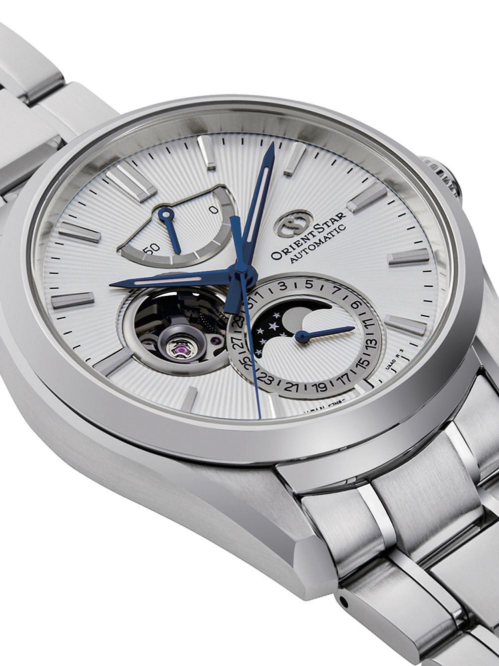 En el corazón de este reloj se encuentra un movimiento automático que, como es habitual en los relojes Orient Star, garantiza un cronometraje preciso y ofrece las siguientes funciones: fecha, pantalla de reserva de energía, minuto, fase lunar, segundo, hora.