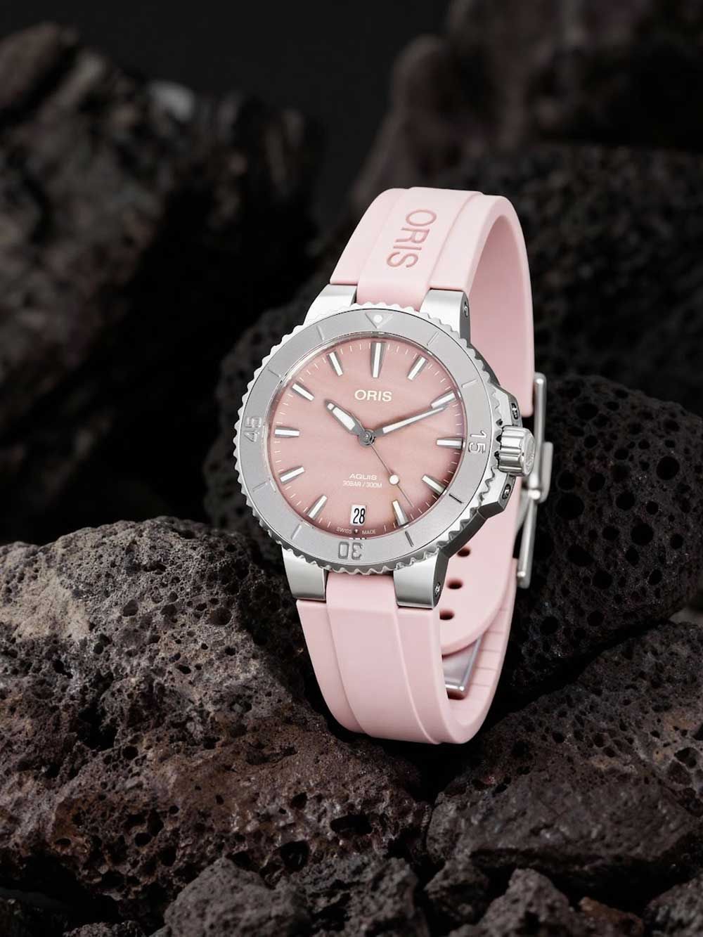 El cristal de reloj tipo “vidrio de zafiro, antirreflectante” ofrece una amplia protección contra arañazos y lesiones accidentales. Debajo está la esfera del nuevo reloj de tus sueños en el color rosa. Manos luminosas, Índices ilumin. contribuyen a la iluminación del Oris 01 733 7770 4158-07 4 18 66FC y permiten una buena legibilidad incluso en condiciones de iluminación desfavorables.