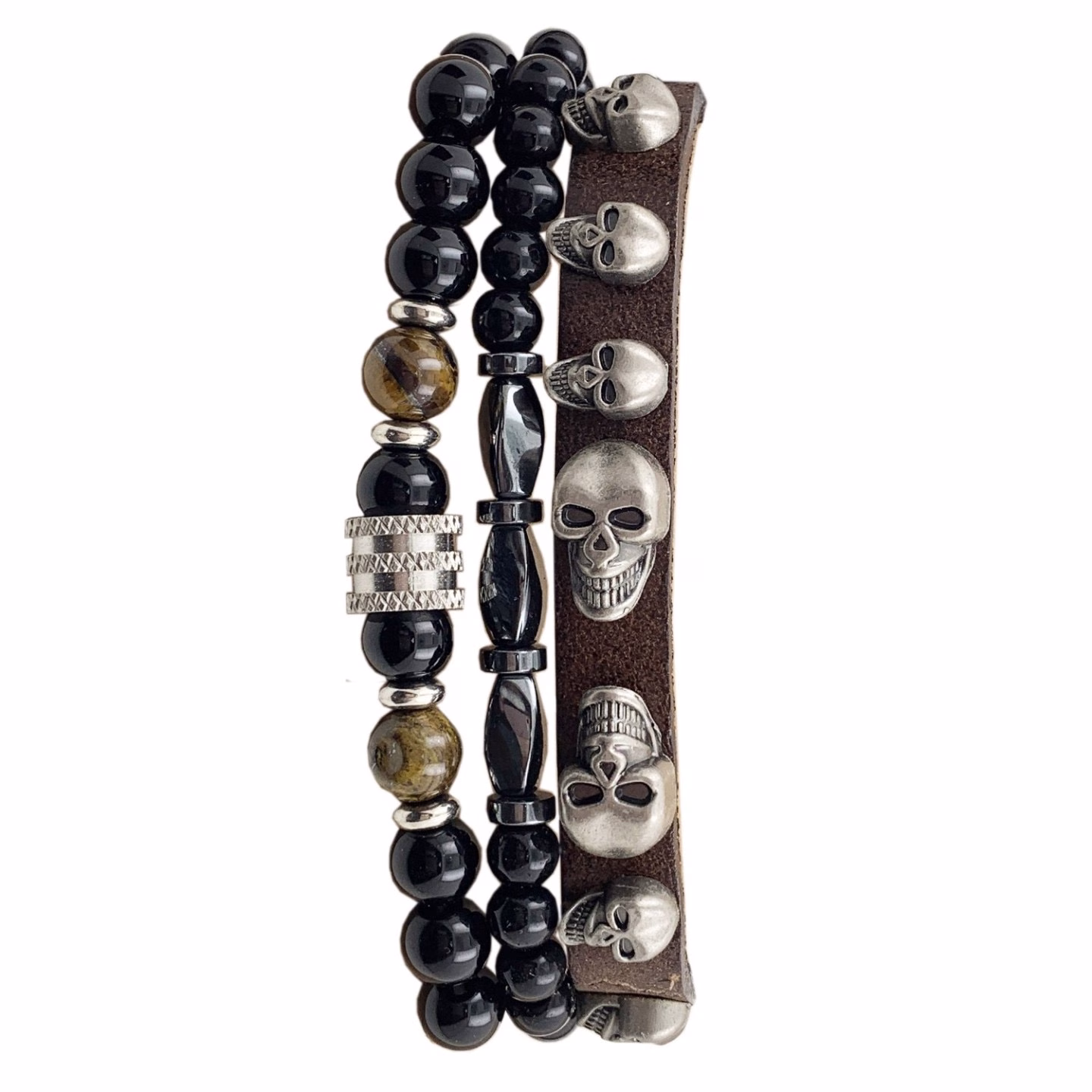 Paquete de tres pulseras de acero y cuero calavera